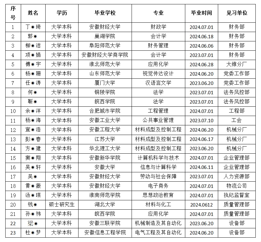 为认真落实省国资委、省委宣传部、省财政厅和人社厅《关于做好2024年安徽省国有企业就业见习工作的通知》(皖国资考分[2024]70号)精神,伟德国际victor1946集团公开招募大学生就业见习,经公司相关单位筛选确定,23名见习生基本信息对外公示,公示期5天(2024年9月5日至9月9日),接受社会监督。监督电话:0551-82189867,0551-82189811。