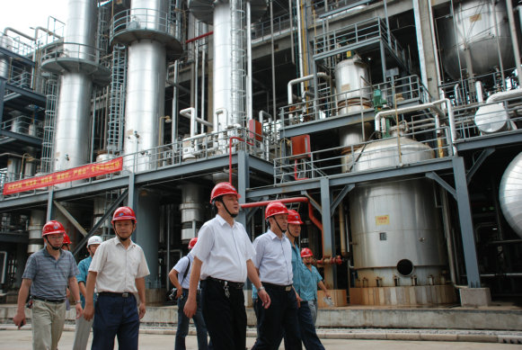 王西平行在吴福胜、张东华等人的陪同下,还到醋酐、有机等化工生产线现场调查了解安全生产、安全设施状况。 (方华/摄影报道)